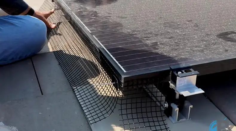 - Plastic or stainless steel netting – Installed above, below, or surrounding solar arrays. Costs $0.10 to $0.40 per watt.